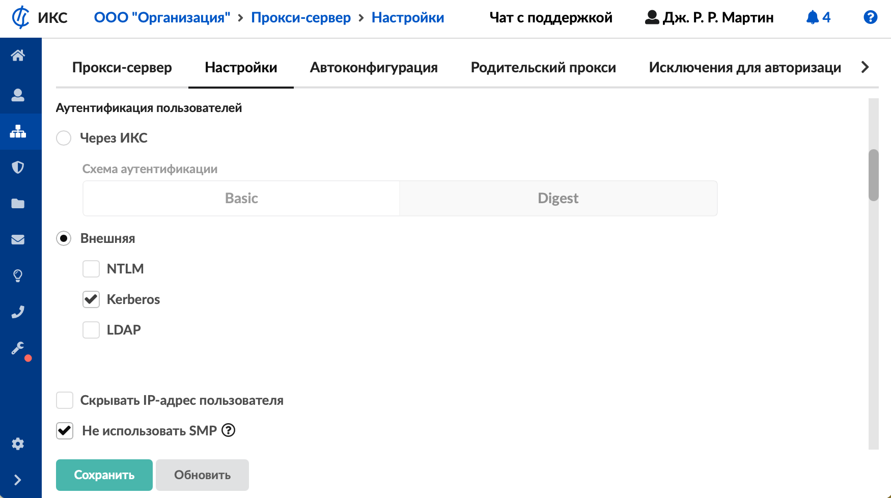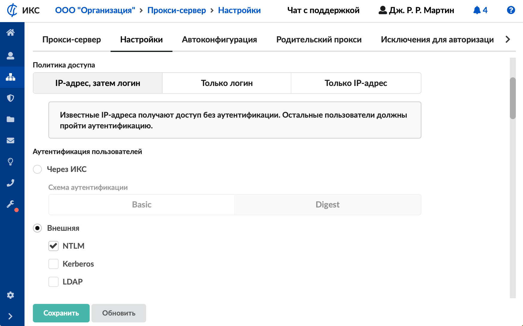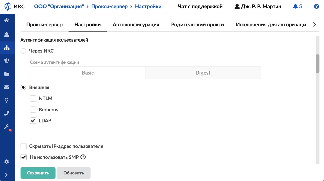 - В меню Сеть > Прокси > Настройки выберите тип авторизации «LDAP».
