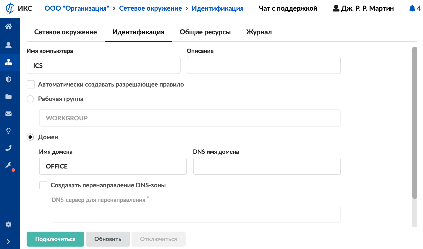 - В меню Сеть > Сетевое окружение > Идентификация установите переключатель для роли ИКС «Домен».