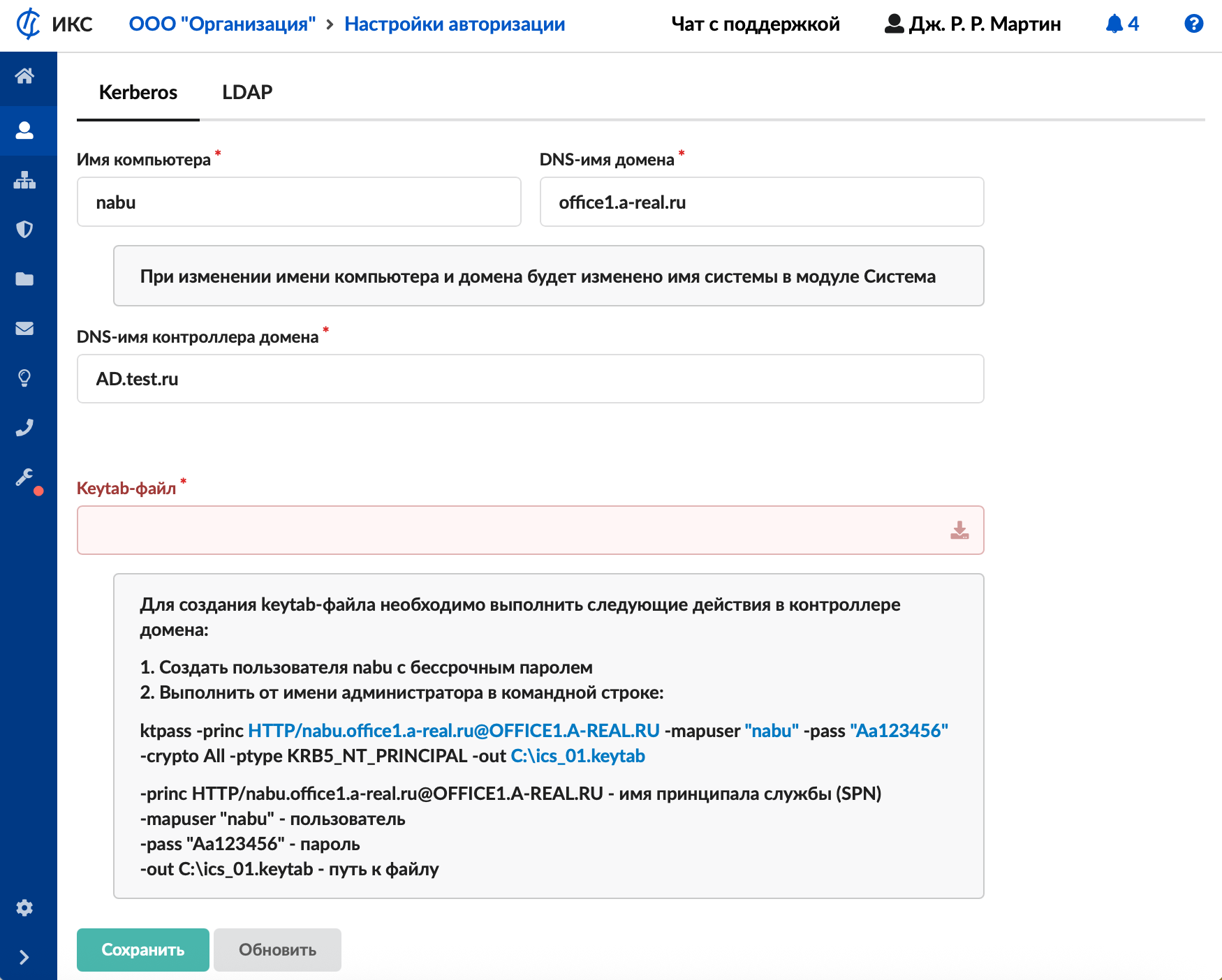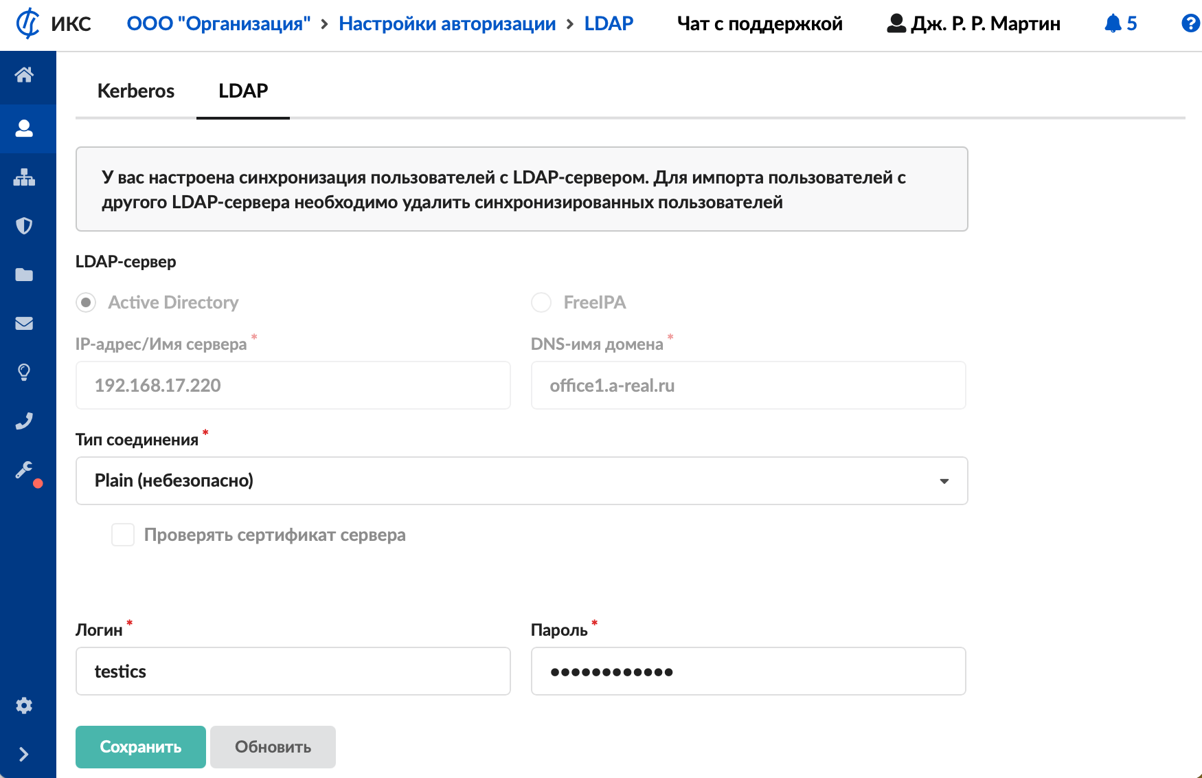 - В меню Пользователи и статистика > Настройки авторизации > Kerberos настройте соединение с доменом в сети.