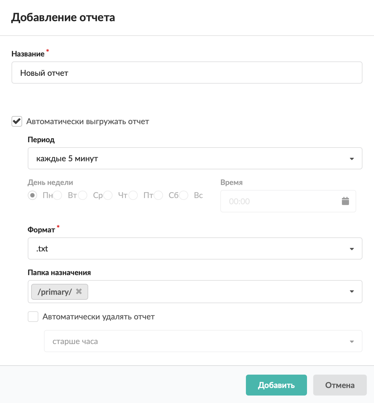 - Для общего отчета также есть возможность настроить автоматическую выгрузку. Выберите параметры: период, день недели и время выгрузки, формат, папка назначения. Если требуется, настройте автоматическое удаление отчета.