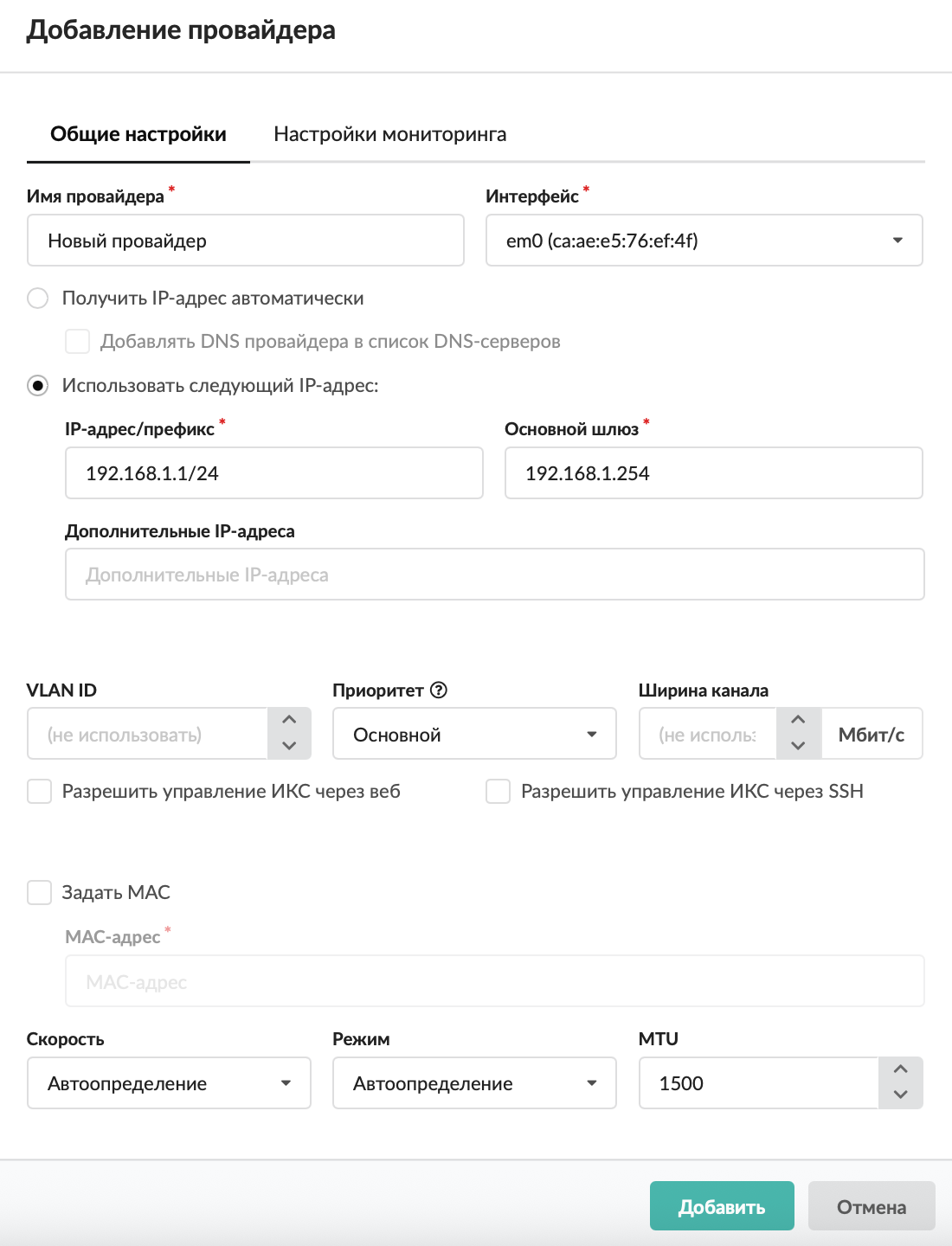- Выберите интерфейс, на который будет назначен данный провайдер.