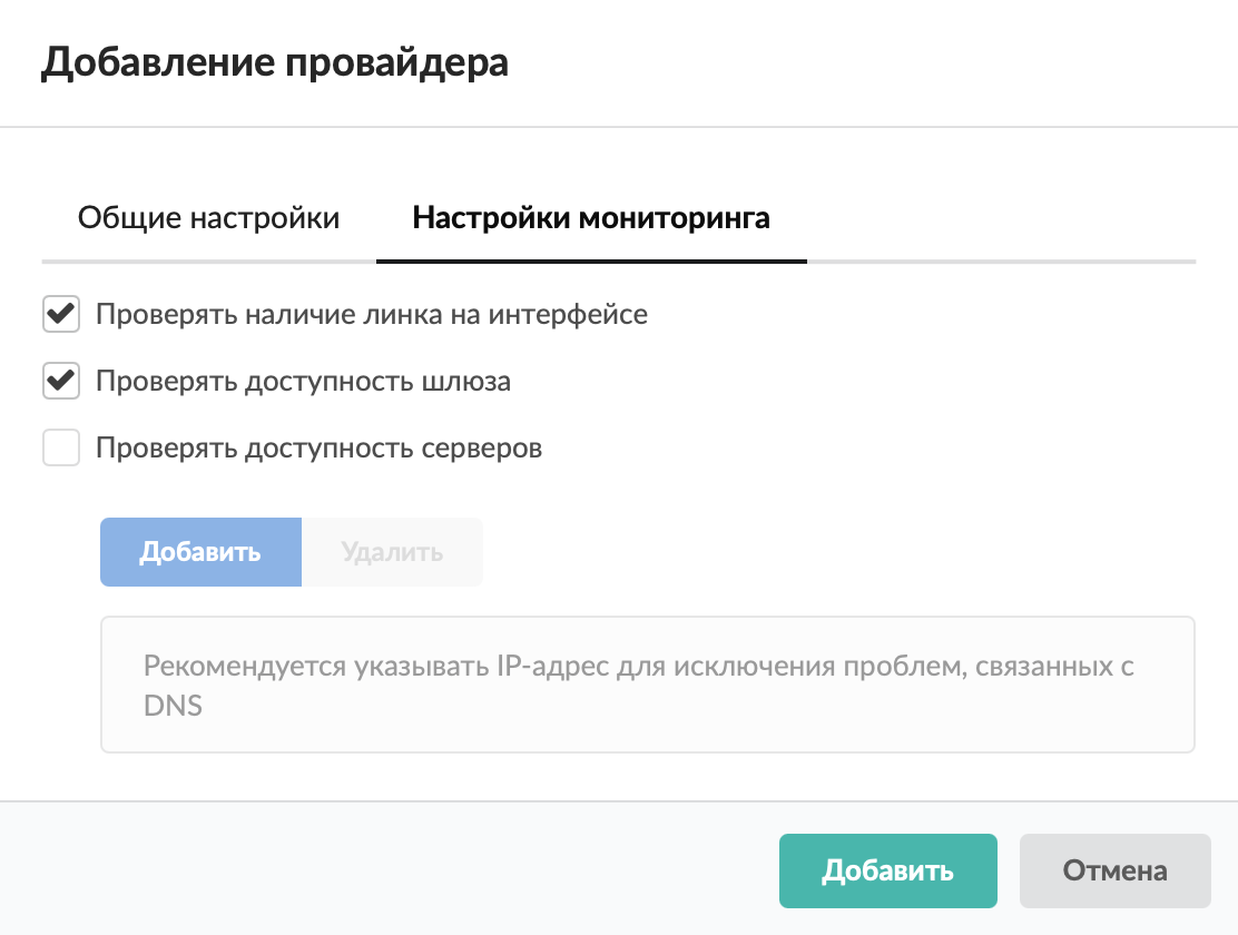 - На вкладке «Настройки мониторинга» установите, каким образом ИКС будет понимать, что основной (Провайдер 1) недоступен и пора переключиться на резервного (Провайдера 2). ИКС может определять доступность провайдера по нескольким критериям, которым соответствуют флаги: