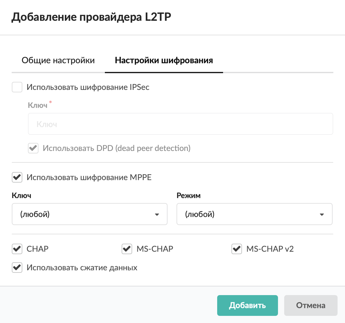 - Заполните вкладки «Общие настройки» и «Настройки шифрования» по аналогии с настройками провайдера PPTP.