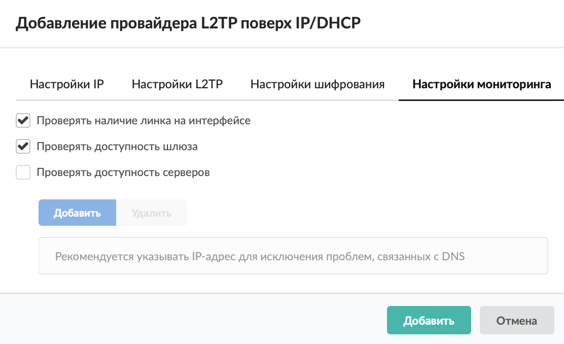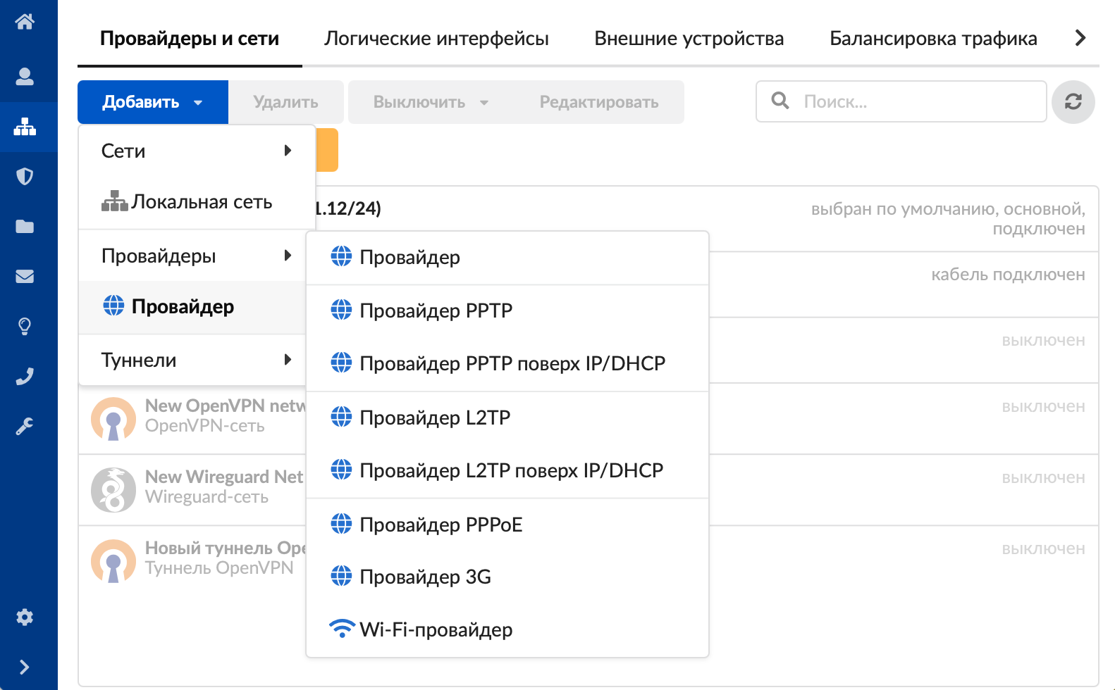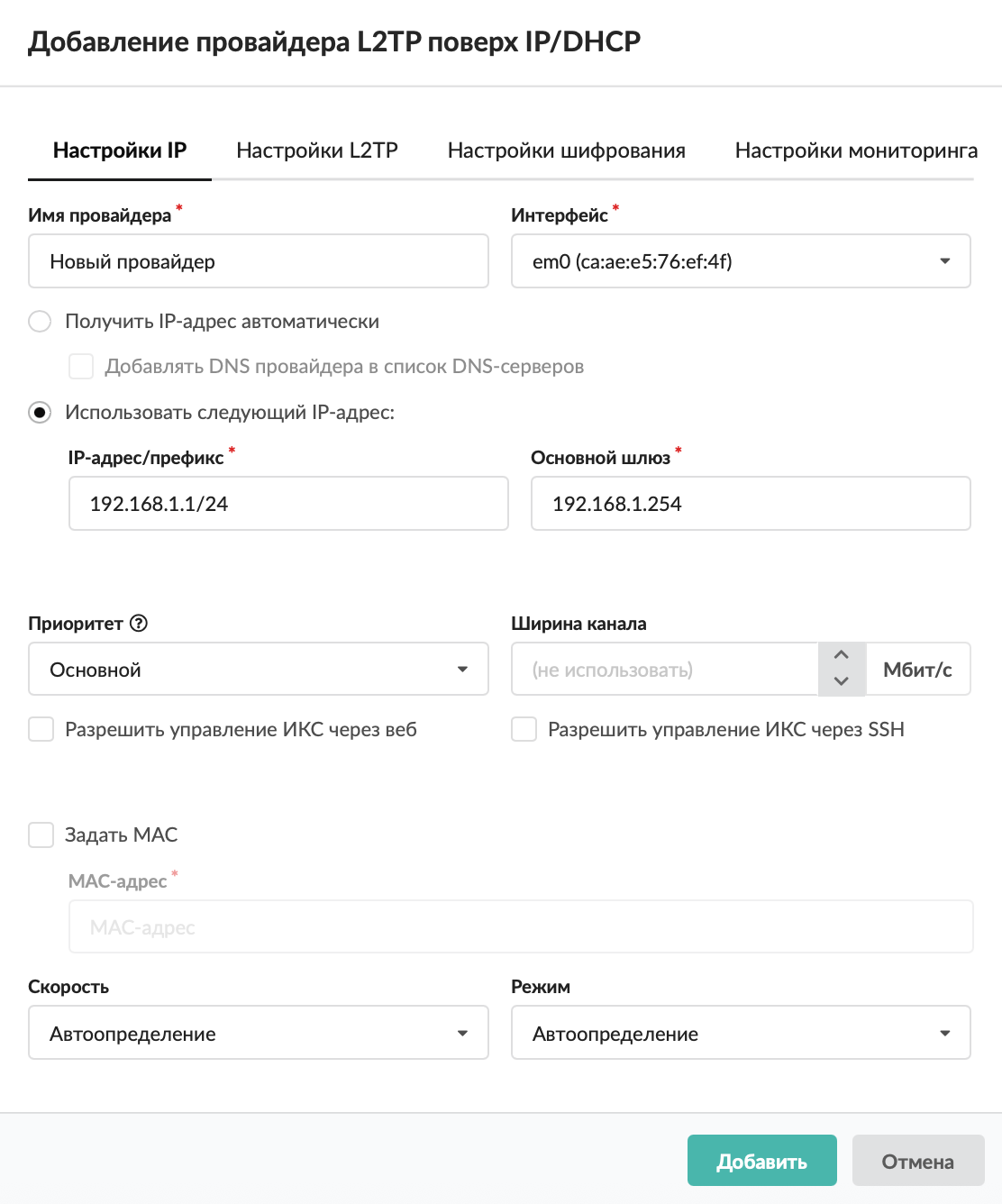 Добавить провайдер L2TP поверх IP/DHCP можно в меню Сеть > Провайдеры и сети. Для этого выполните следующие действия: