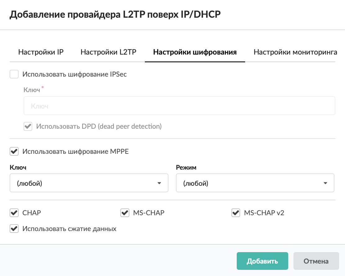 - Определите параметры шифрования на вкладке «Настройки шифрования» по аналогии с настройкой провайдера L2TP.