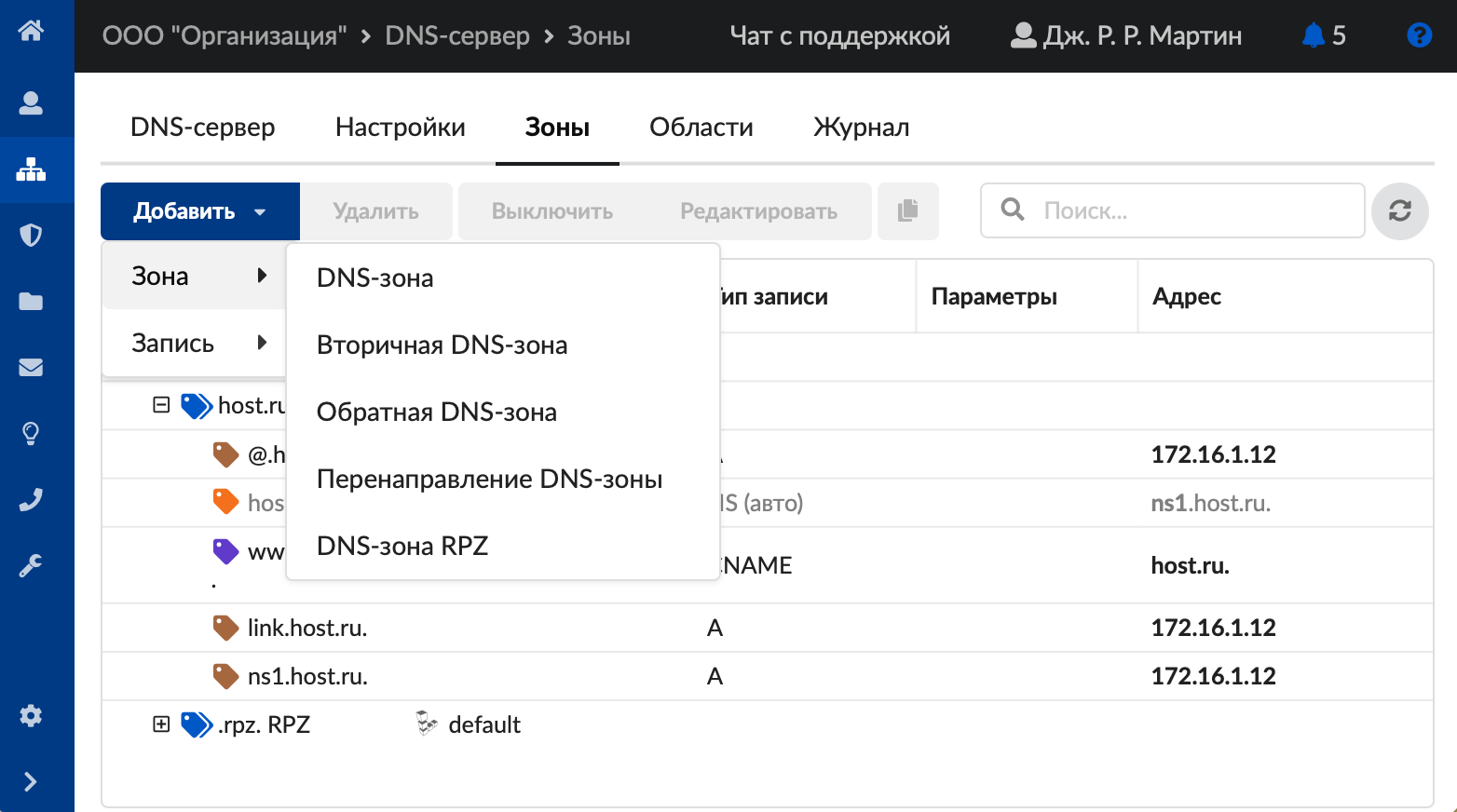 Добавить обратную DNS-зону можно в меню Сеть > DNS > Зоны. Для этого выполните следующие действия: