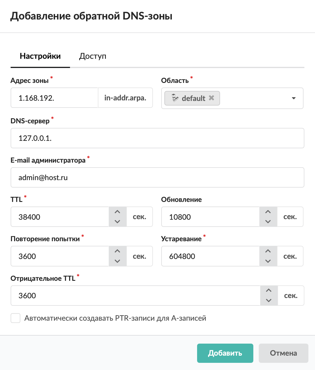 - При необходимости установите флаг «Автоматически создавать PTR-записи для А-записей».
