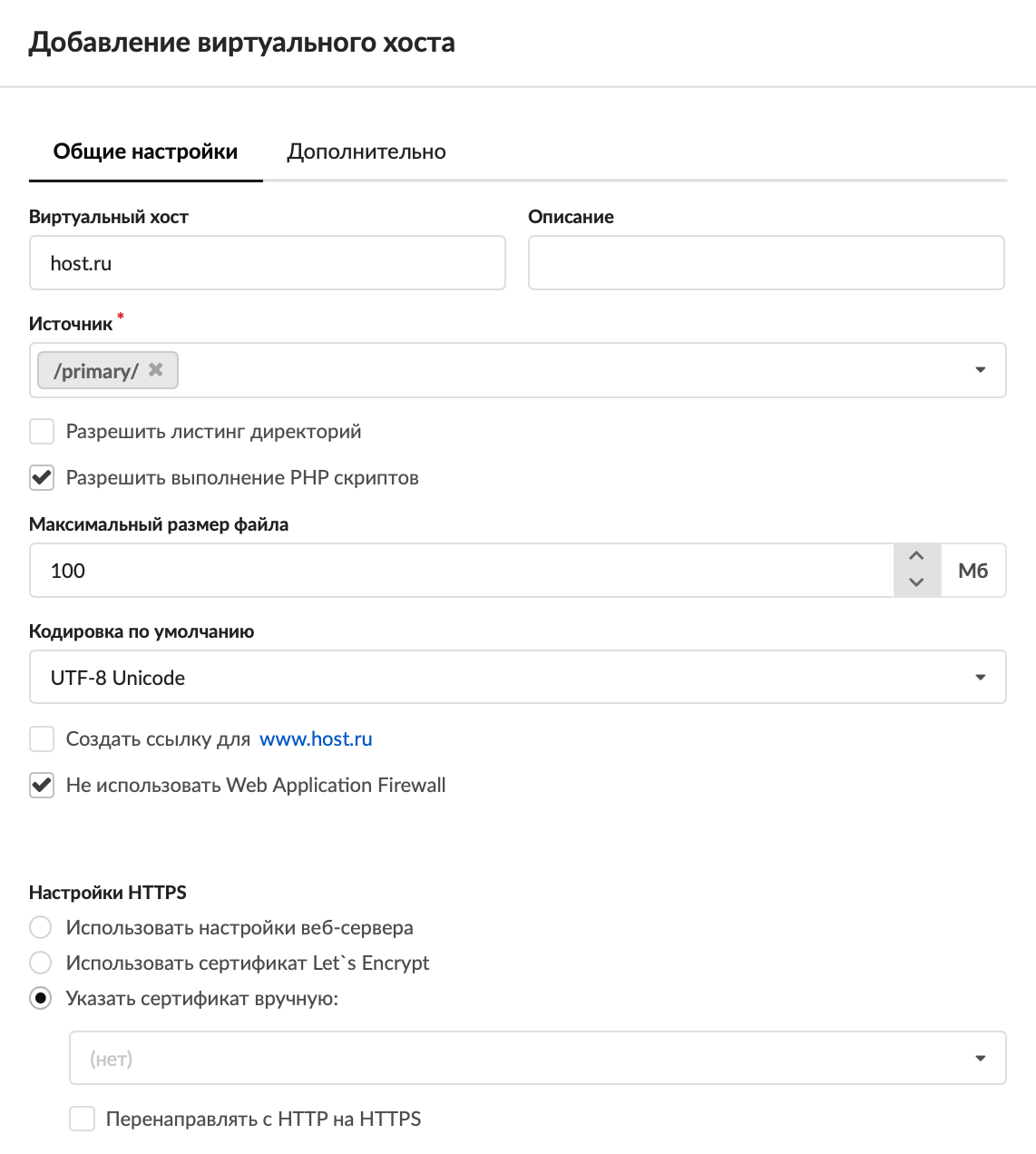 - указать сертификат вручную — будут использованы настройки веб-сервера с указанным сертификатом. Здесь можно задать сертификат и перенаправление с HTTP на HTTPS (флаг перекрывает действие аналогичного флага в настройках веб-сервера).