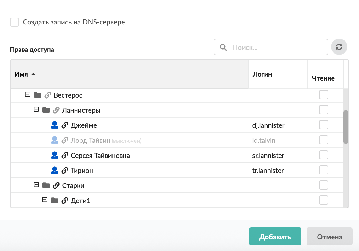 - Назначьте права доступа к ресурсу. Для этого установите флаги напротив пользователей в столбце «Чтение».