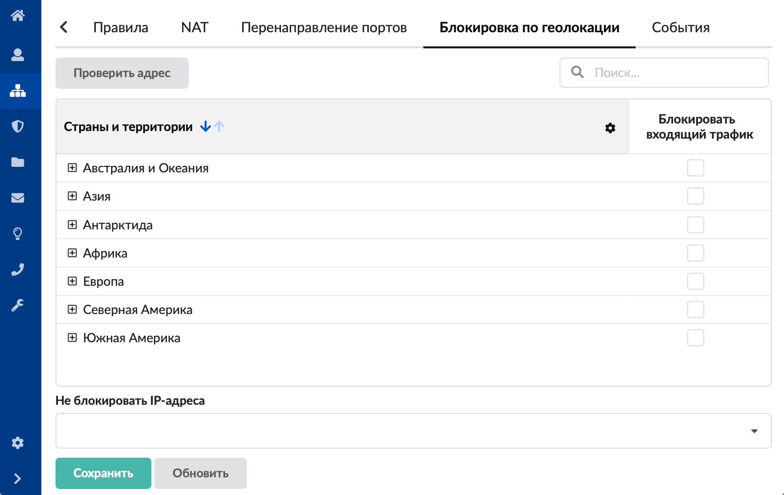 В таблице можно выбрать, какой входящий трафик блокировать. Для этого установите флаг напротив континента либо конкретных стран.