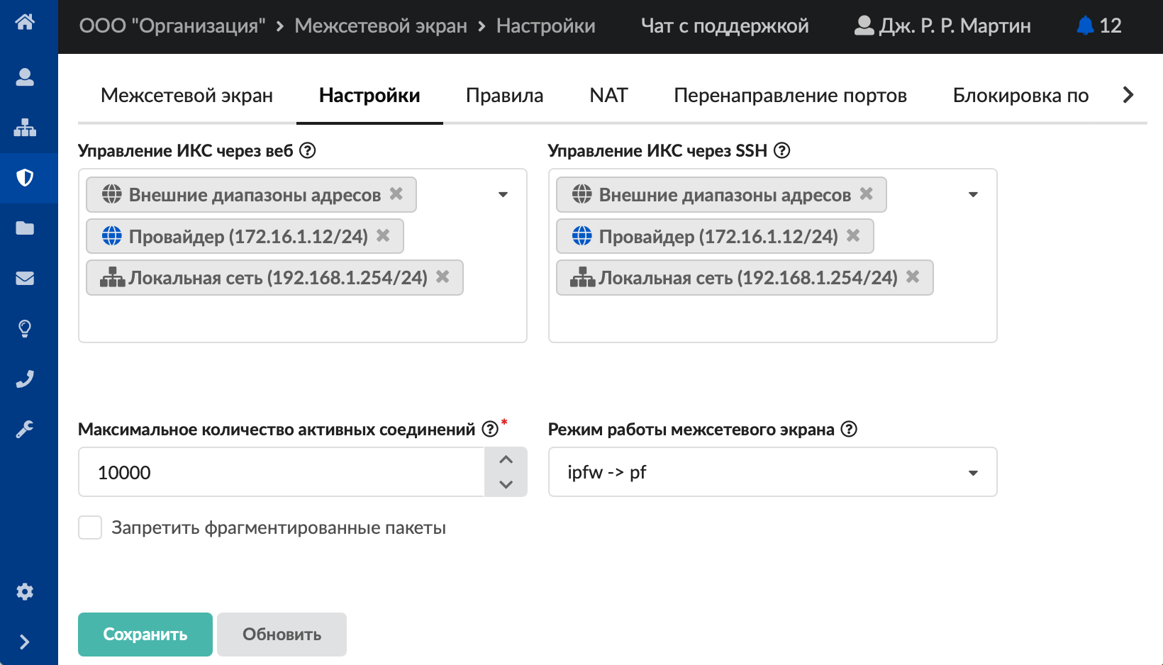 - в меню Защита > Межсетевой экран: