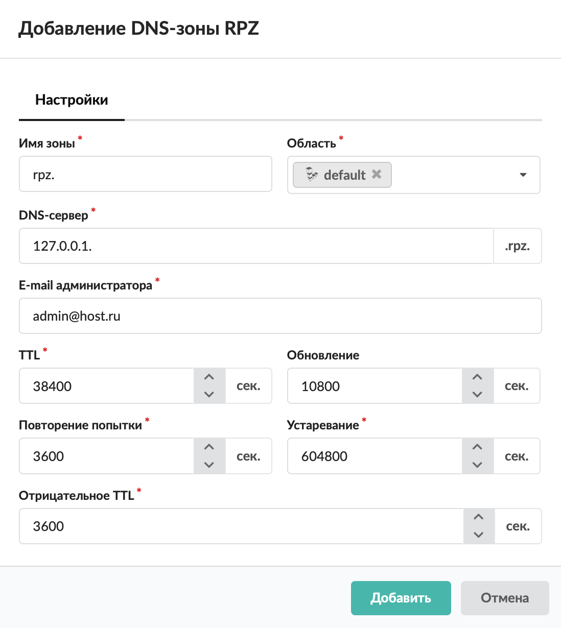 Добавить DNS-зону RPZ можно в меню Сеть > DNS > Зоны. Для этого выполните следующие действия: