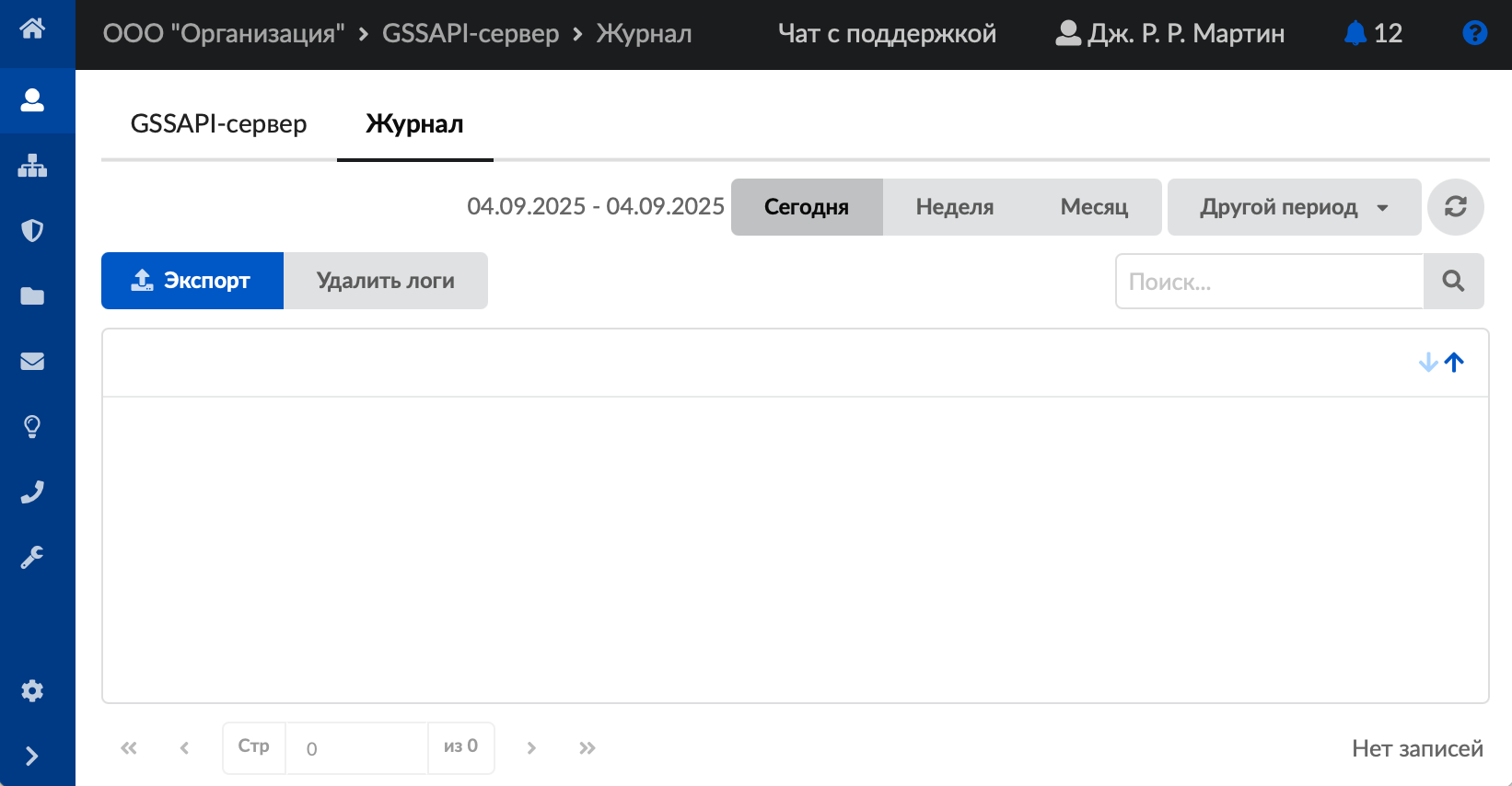 На данной вкладке отображается сводка всех системных сообщений GSSAPI-сервера с указанием даты и времени.