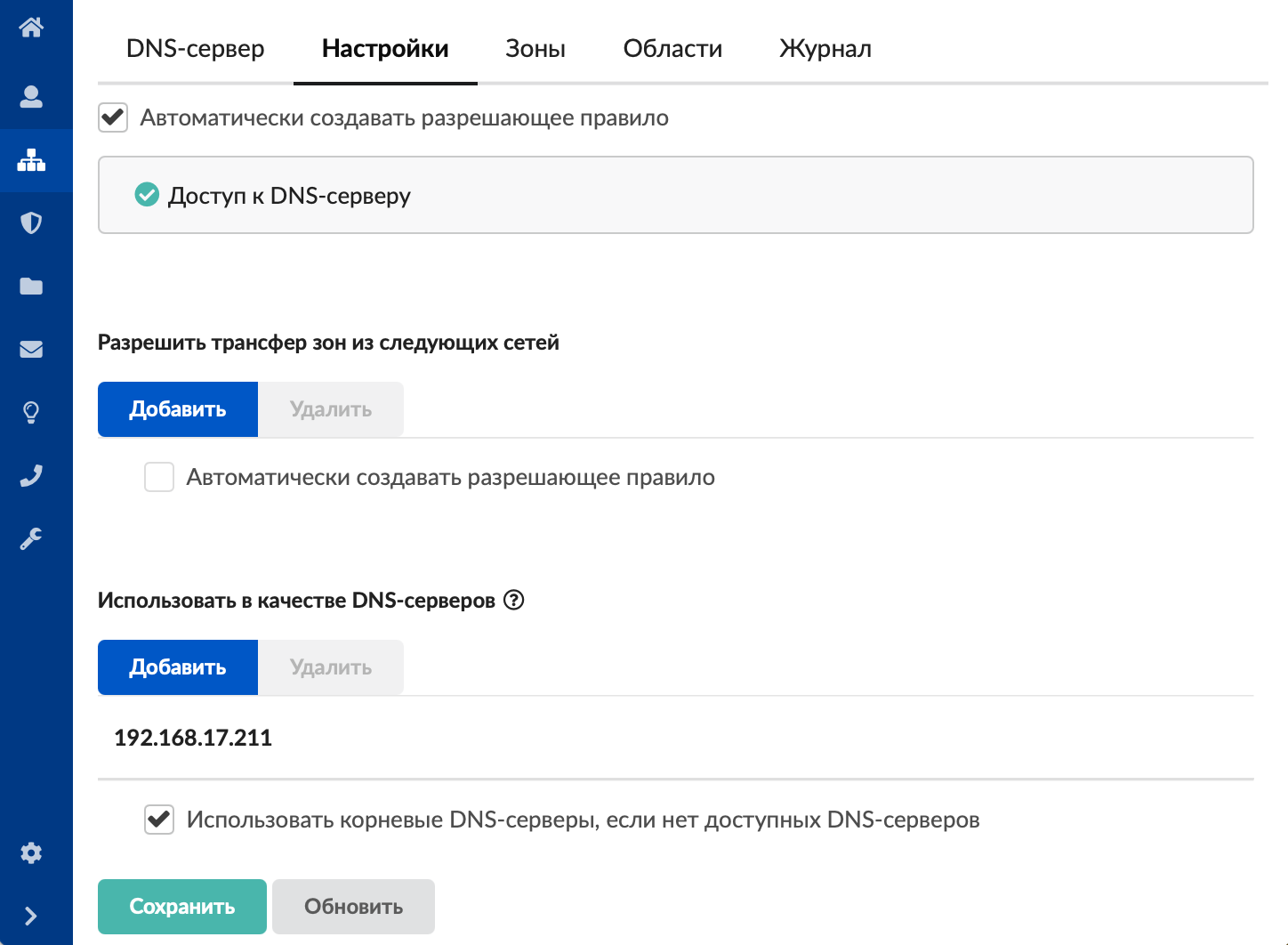 - Основной внешний параметр DNS-сервера — это список разрешений для трансфера зон. По кнопке «Добавить» можно внести в список адреса других DNS-серверов, которые имеют право получать записи зон от ИКС.