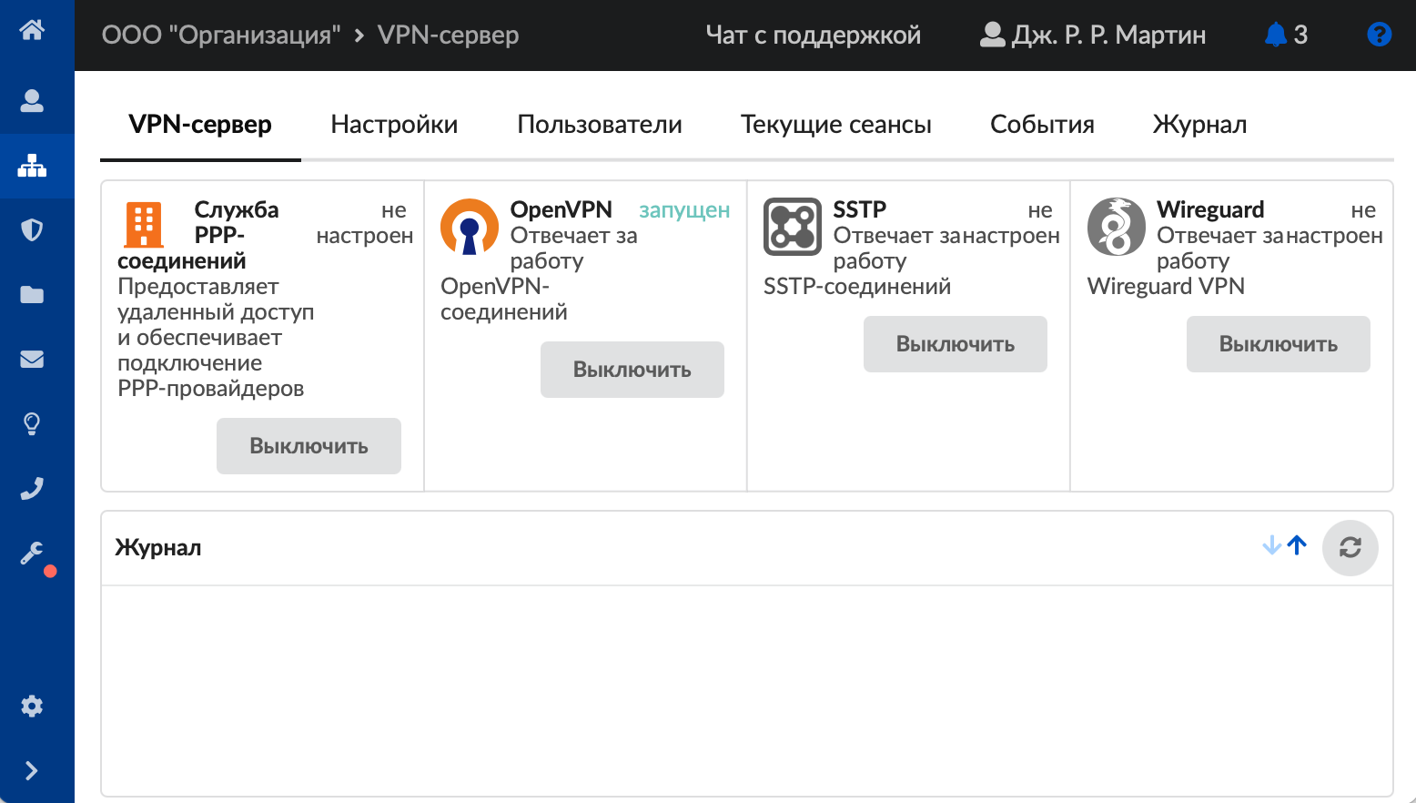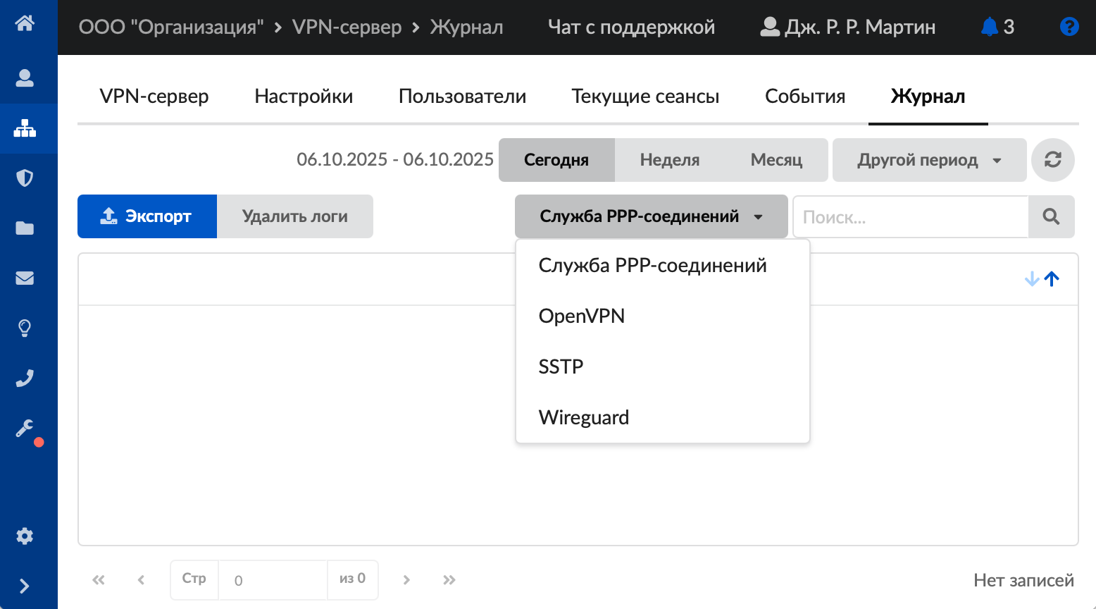 По умолчанию в журнале отображаются сообщения службы PPP-соединений. Чтобы переключить сводку на OpenVPN, SSTP или Wireguard, нажмите на соответствующую кнопку и выберите нужную службу.