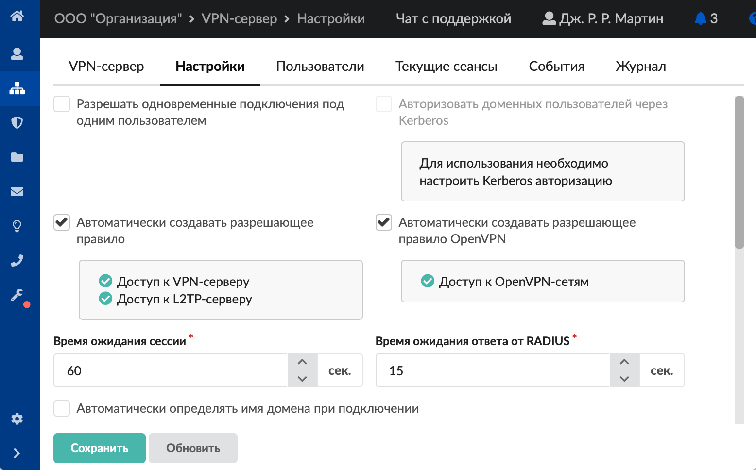 - «Разрешать одновременные подключения под одним пользователем» — позволяет подключаться по VPN разным устройствам под логином и паролем одного пользователя;