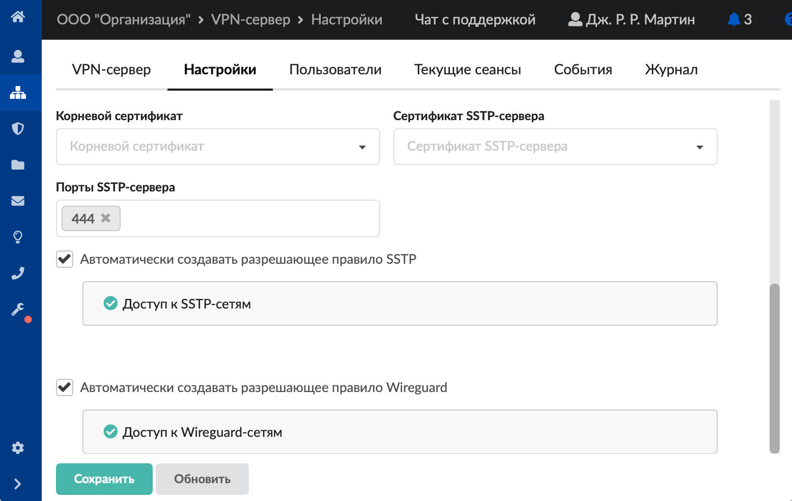 - Если требуется, установите флаги «Автоматически создавать разрешающее правило SSTP» и (или) «Автоматически создавать разрешающее правило Wireguard».