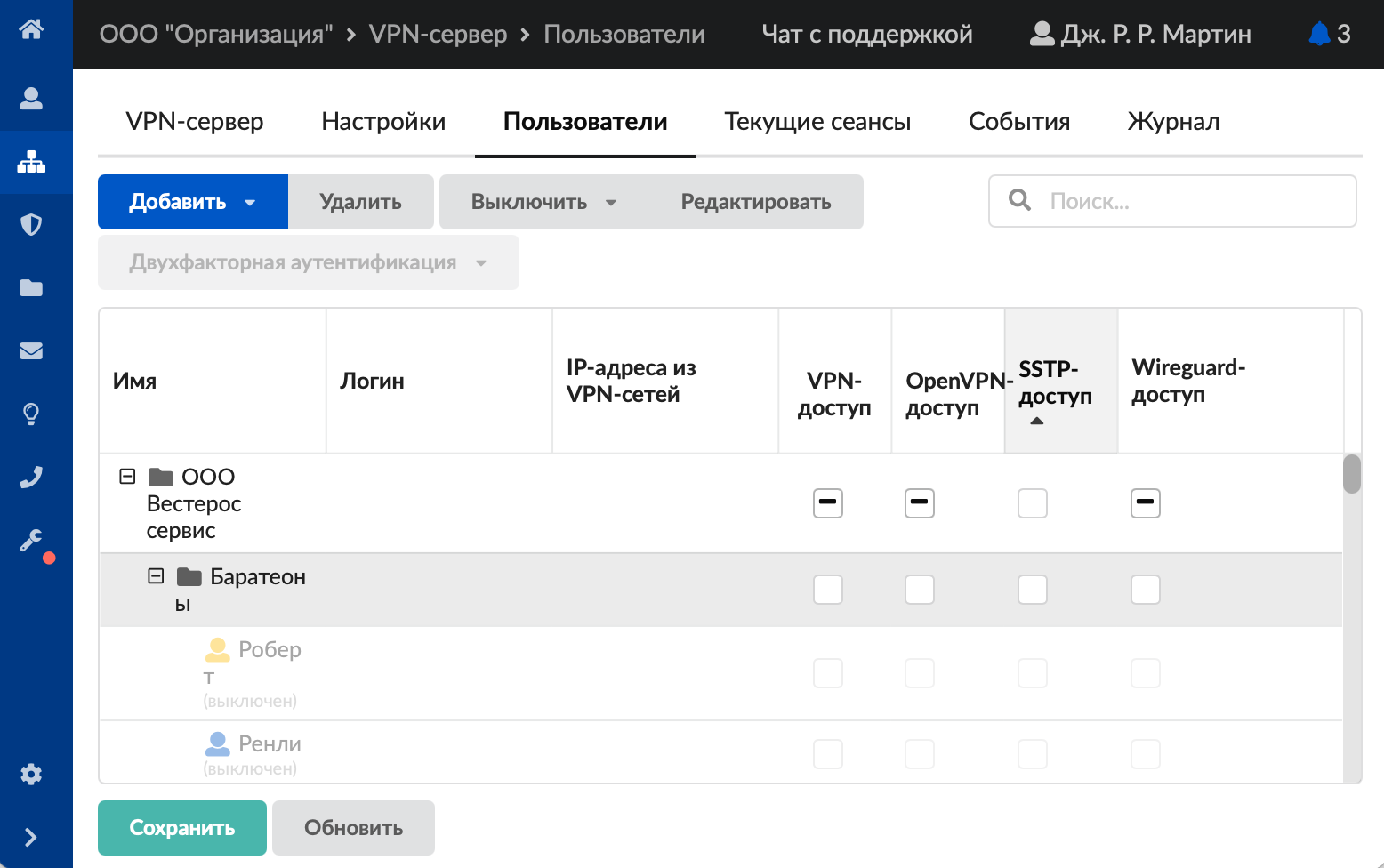 Внимание! Доступ через VPN и SSTP можно дать только пользователям с логином. При этом логин может содержать только цифры, буквы, символы подчеркивания, а также следующие символы: «+», «-», «.», «\».