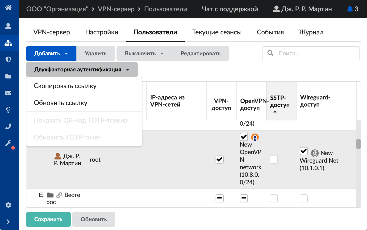 - в настройках VPN-сети, OpenVPN-сети и (или) SSTP-сети установлен флаг «Использовать двухфакторную аутентификацию»;