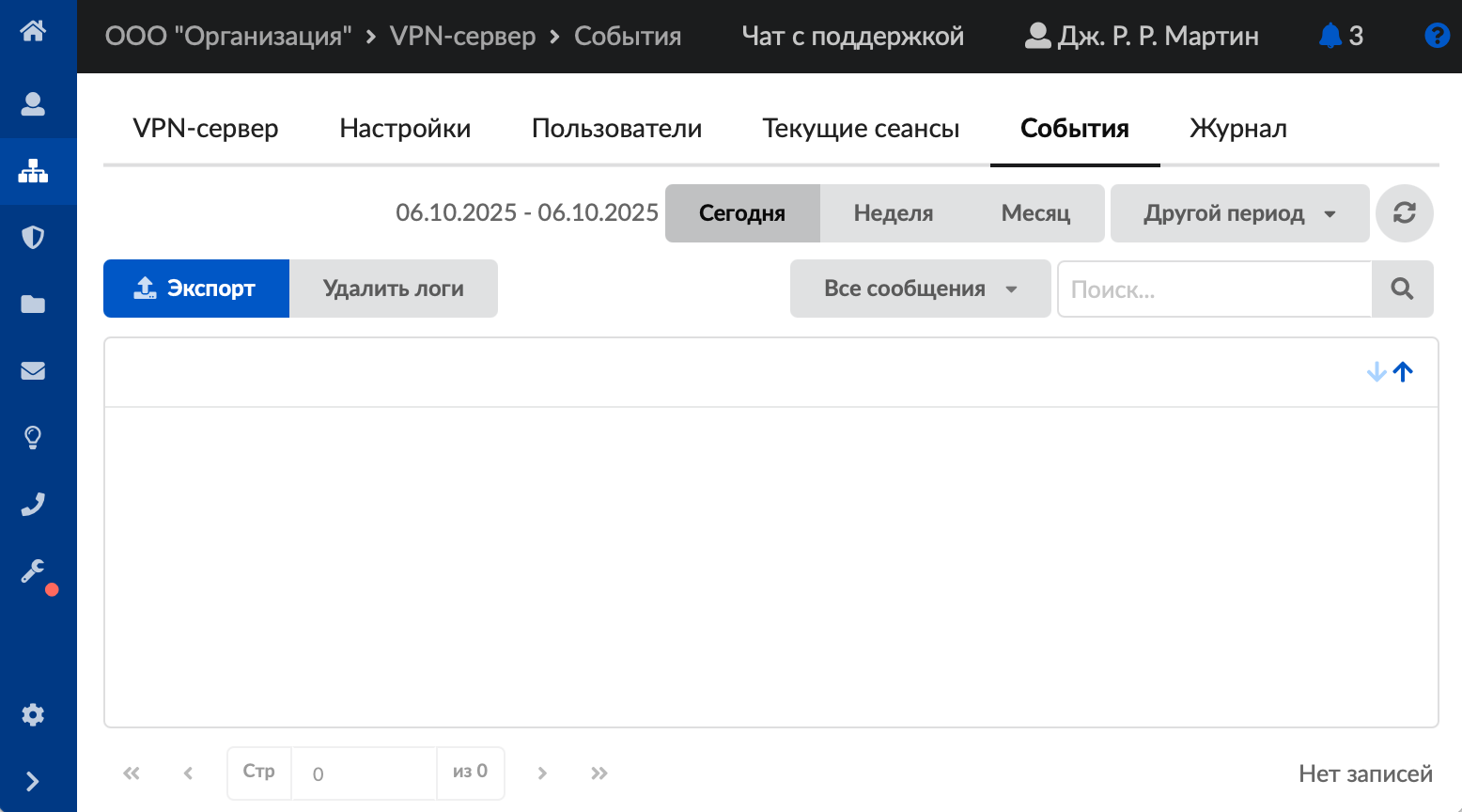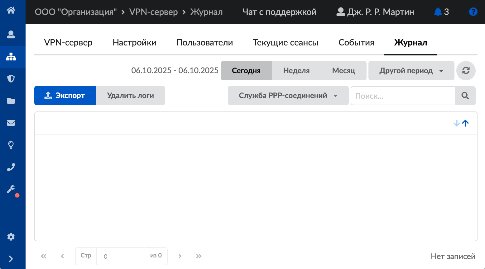 На данной вкладке отображается сводка всех системных сообщений служб VPN-сервера с указанием даты и времени.