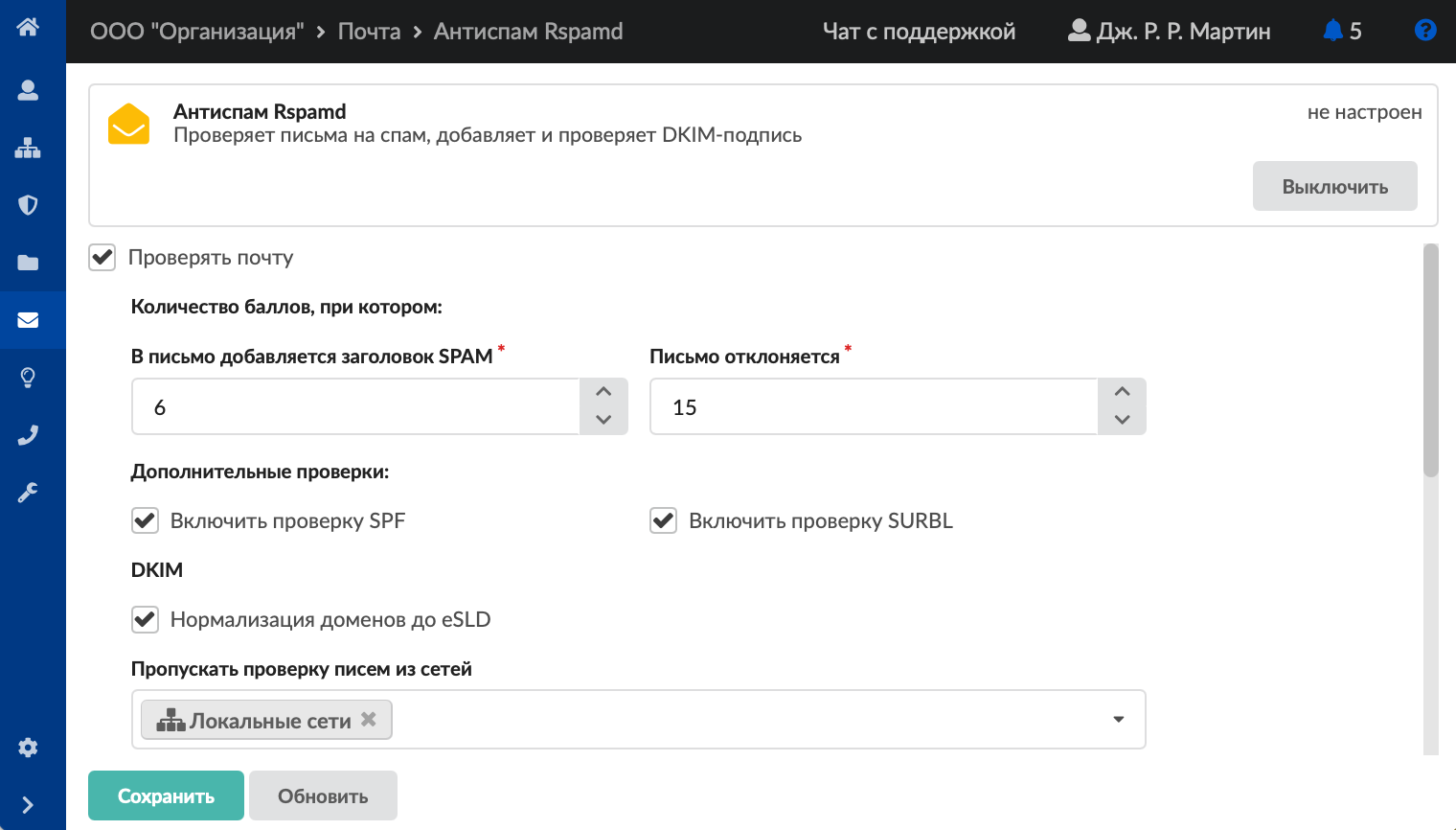 Модуль «Антиспам Rspamd» предназначен для защиты от спама. Если служба определит, что письмо является спамом, она в свойствах письма добавит заголовок SPAM либо отклонит письмо. Данный модуль расположен в меню Почта > Антиспам Rspamd.