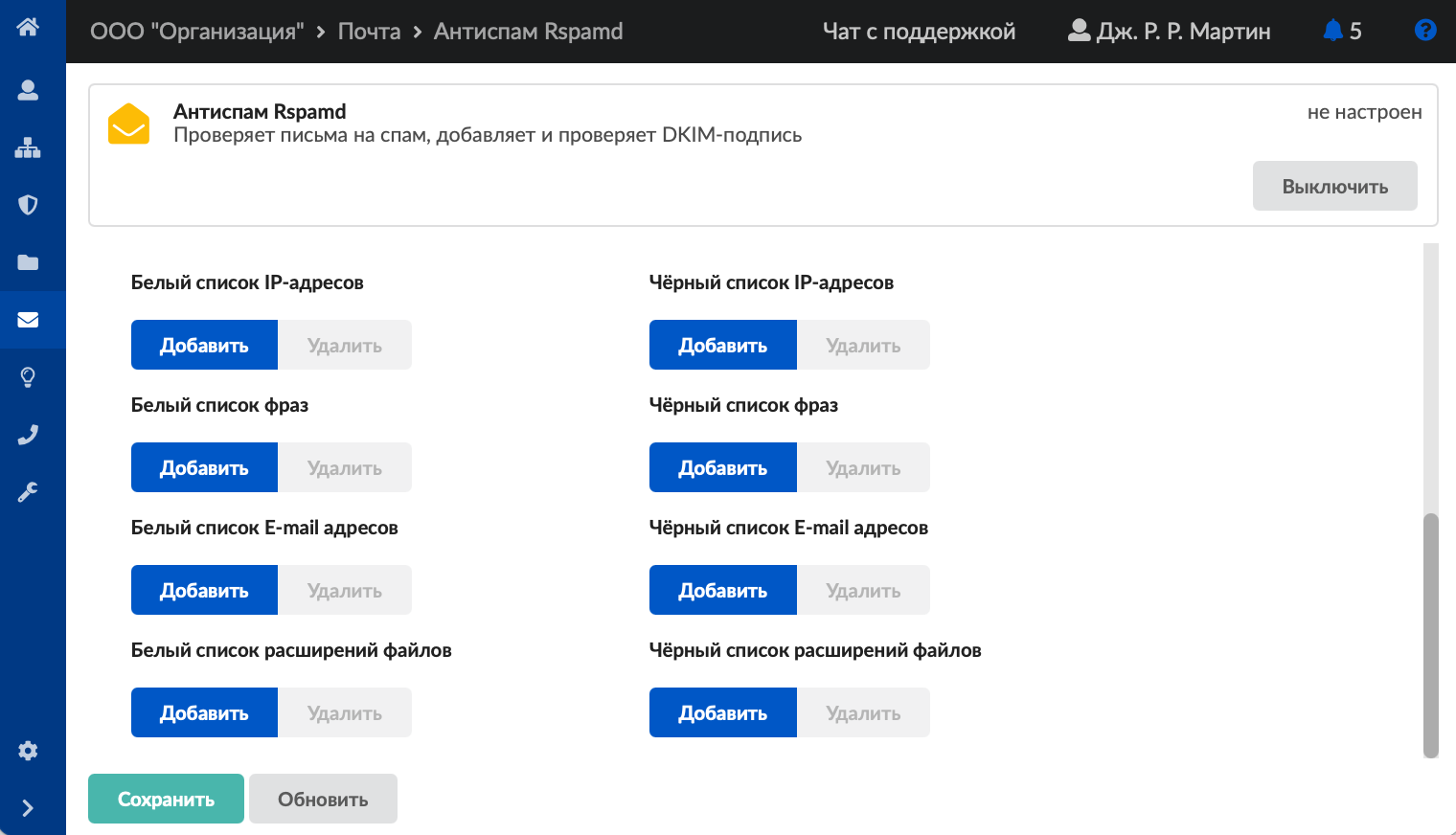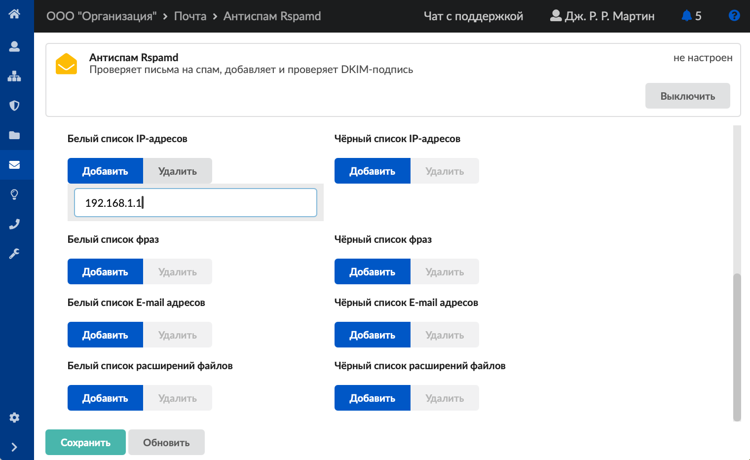 В модуле «Антиспам Rspamd» можно настроить белые и черные списки IP-адресов, фраз, e-mail адресов и расширений файлов.